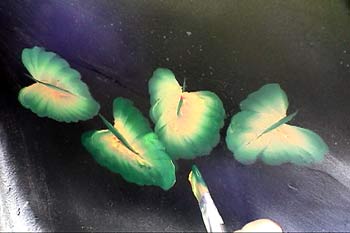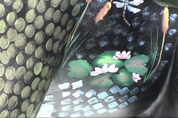 In the right column is a good view of the frog from the front showing all of Linda's pattern work. Look below at her one-stroke leaves and water lillies. She's painting dragon flies and other insects. I might paint a catfish on it, but I don't know yet. We may run out of room. We've had such fun with the kids in the neighborhood, we are involving them in some way. Linda's idea was to allow them to put their hand prints somewhere on the frog (in their favorite colors, of course.