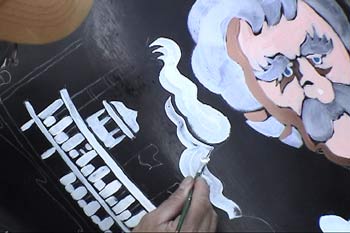 As you can see by the progress on the right, I'm working on figurals while Linda works on motifs and decorative sections. We are making room for quotes from Twain books and essays.