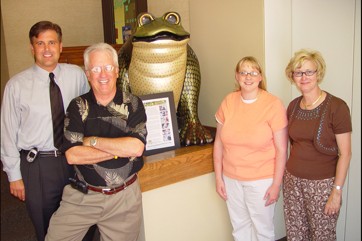 Above, John Link, Gary Olsen, Kristin Driscoll, and Linda Olsen are photographed with the finished frog at the entrance to Cottingham & Butler in downtown Dubuque. The installation is contained in the Part 3 movie in the right column. Kristin was the C&B employee whose theme was selected for the frogn project.