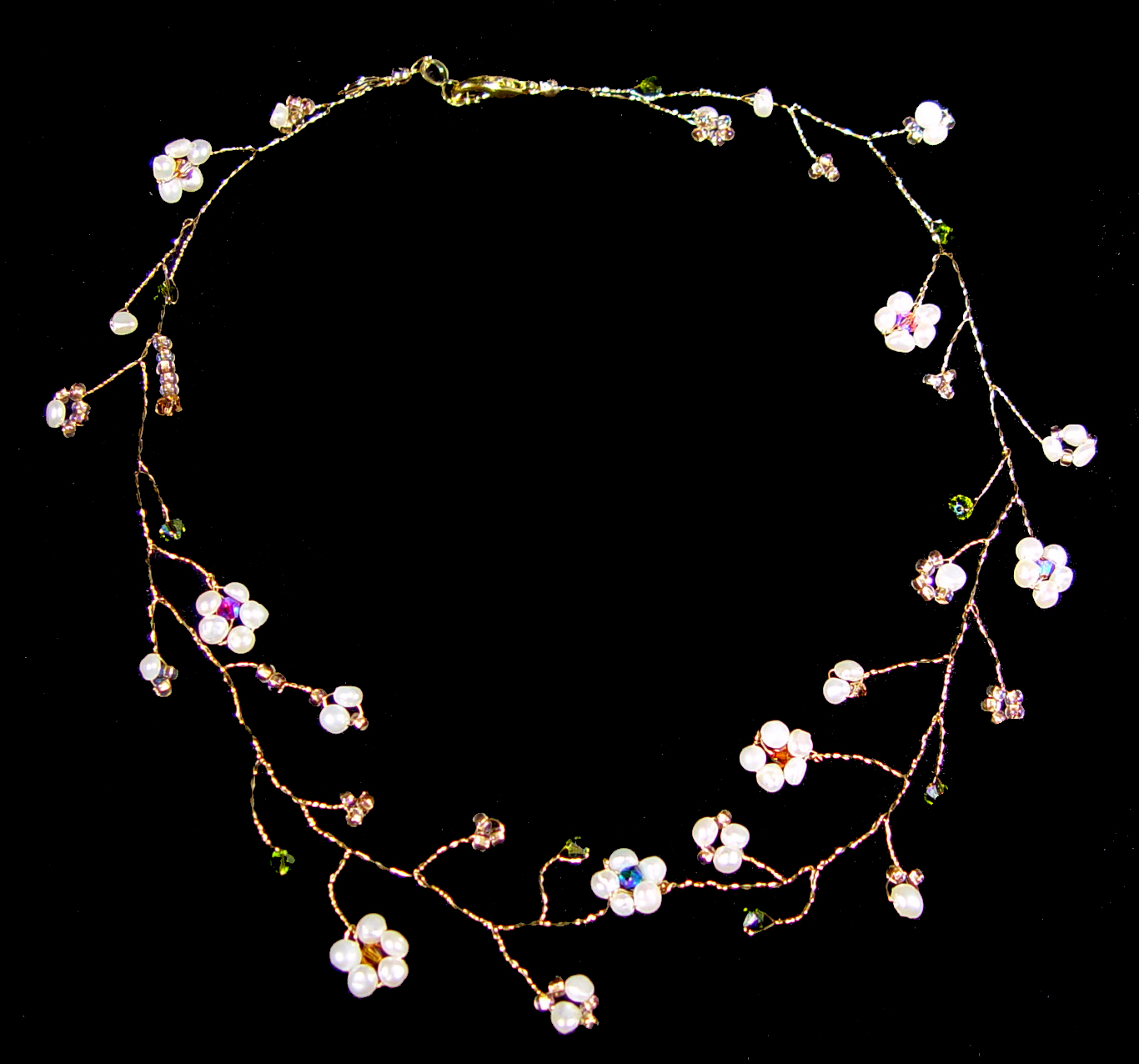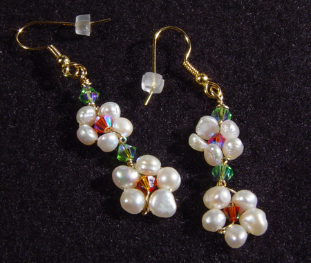 This closeup shows the variety of colors of crystals and shapes of pearls used. |